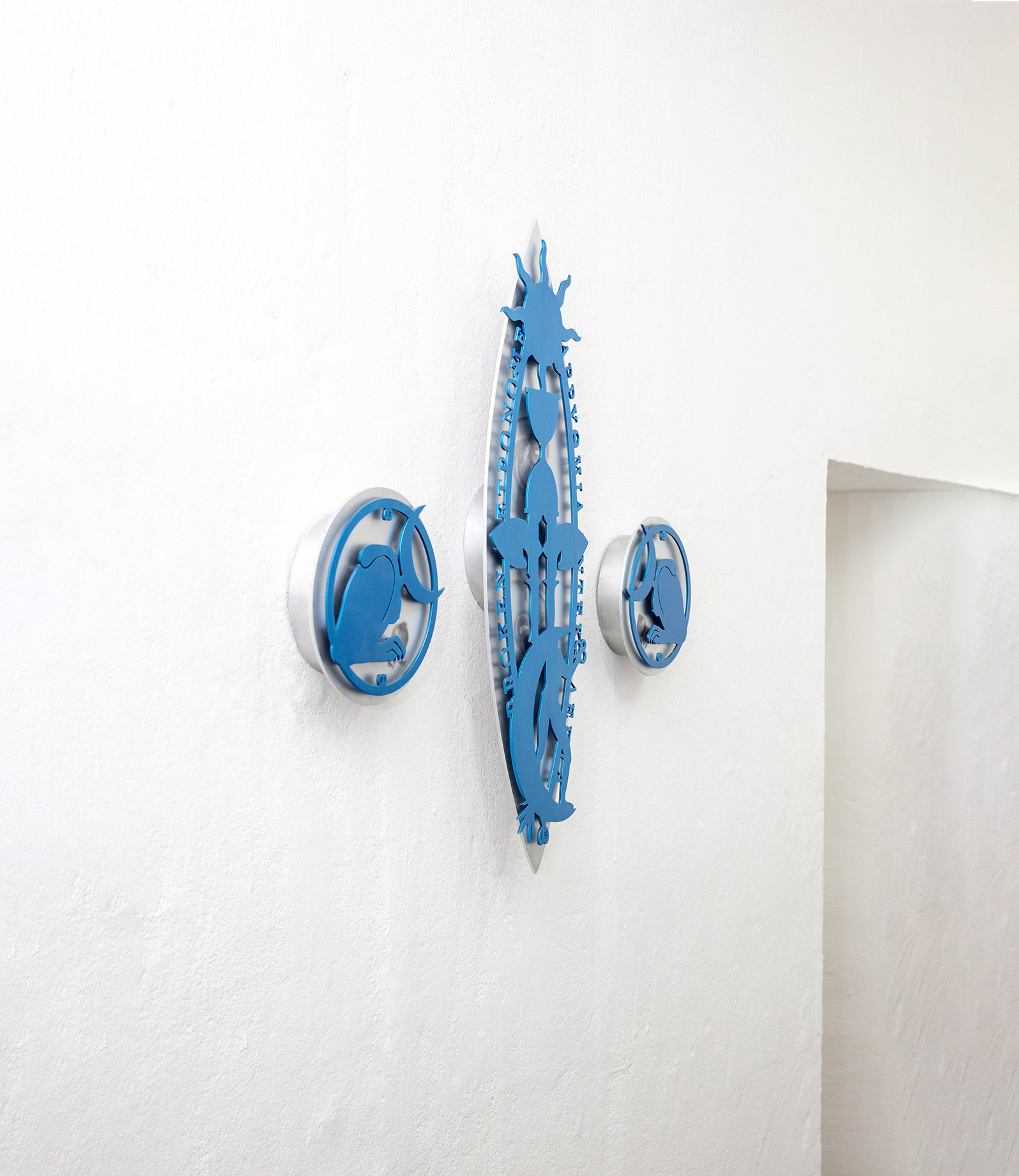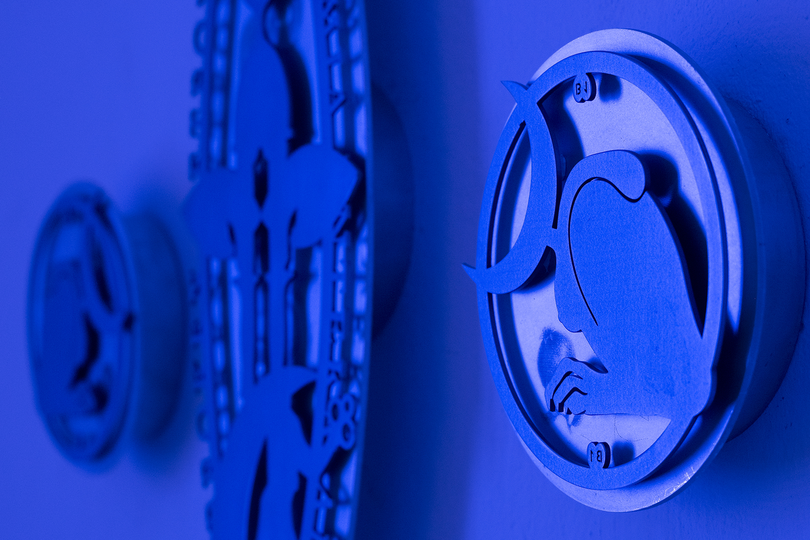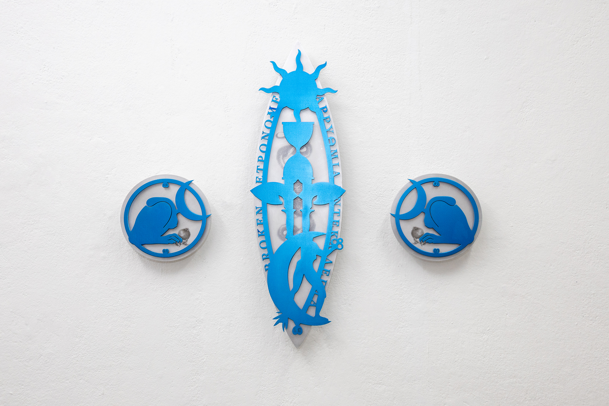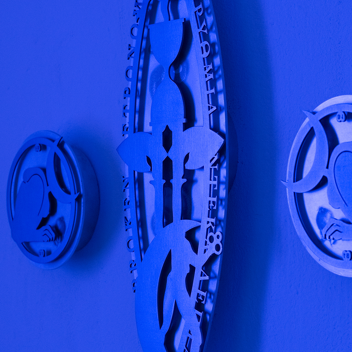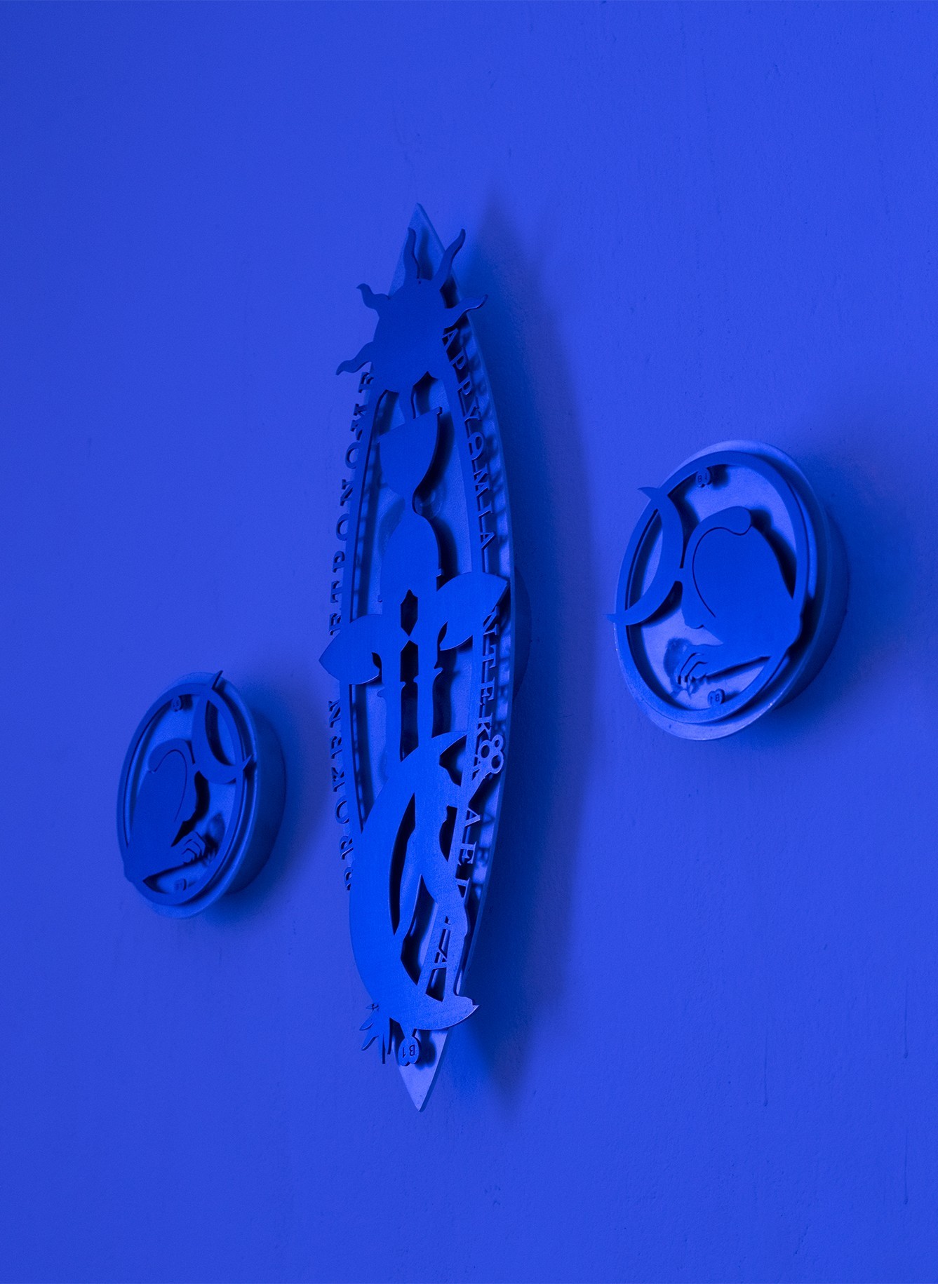 The artwork reads like a mythic code and is structured as a sacred triptych made of two layers: a collage of symbols from the story and the printed layer that reveals another hidden dimension coming from the unconscious. M.’s short death becomes a visual language for survival, for the beauty and violence of returning after breaking.