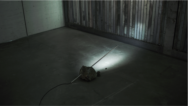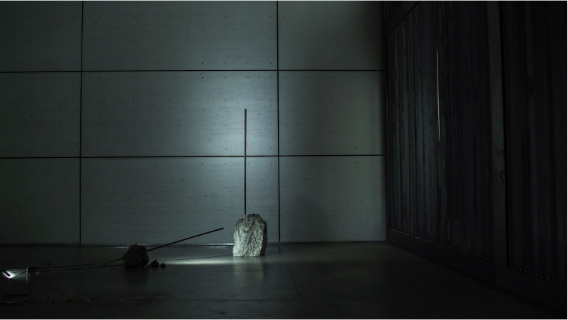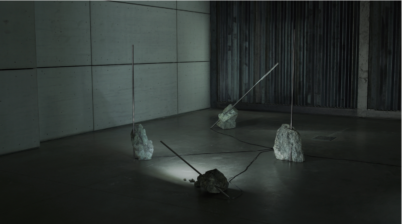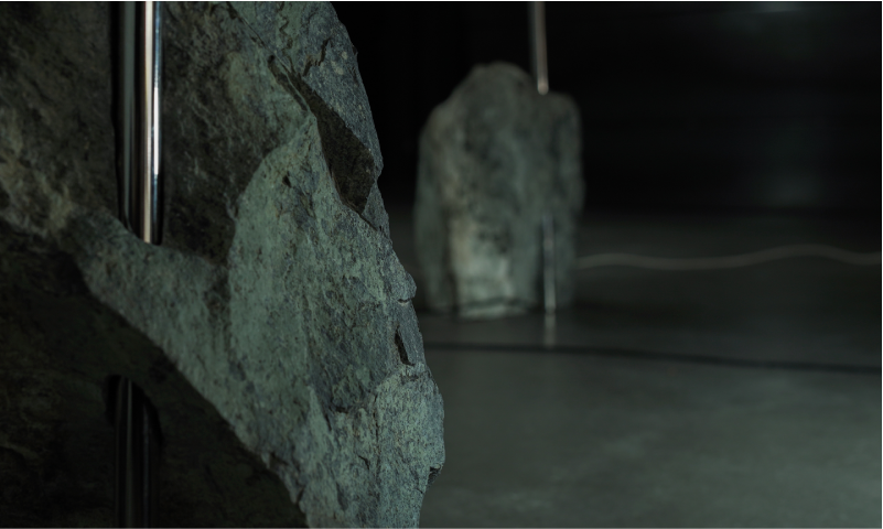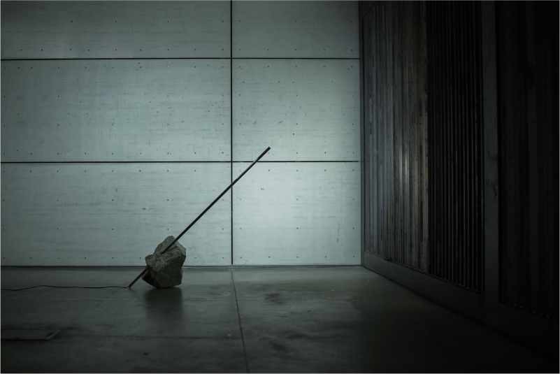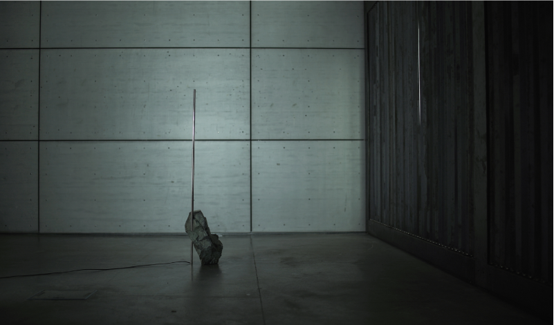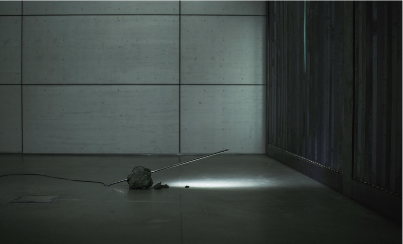 The inox symbolizes industry, technology and alienation. It is the material used in the production of weaponry and sophisticated, modern machinery. It indicates brute force and strength, immortality and utter perfection, it cannot be destroyed and it never disappoints. These are the ideals of a modern industrialised society. In contrast to this, the unprocessed mass of rock represents nature and eternity. It expresses archetypal emotion and the strength of nature which formed it. The rock is still ‘alive’ as it continues to change, to transform. It has no finalised form, it breaks and crumbles even as it is being handled and transported. Perishability and loss are both in the nature of the rock, as it is enveloped in a poetic weakness.