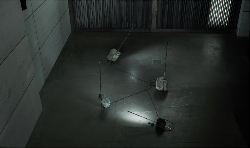 The origin of the materials is also contradictory. On the one hand the inox and the LED mechanisms are industrialized products, while on the other, remnants of marble masses were selected from the abandoned mines of Tinos.