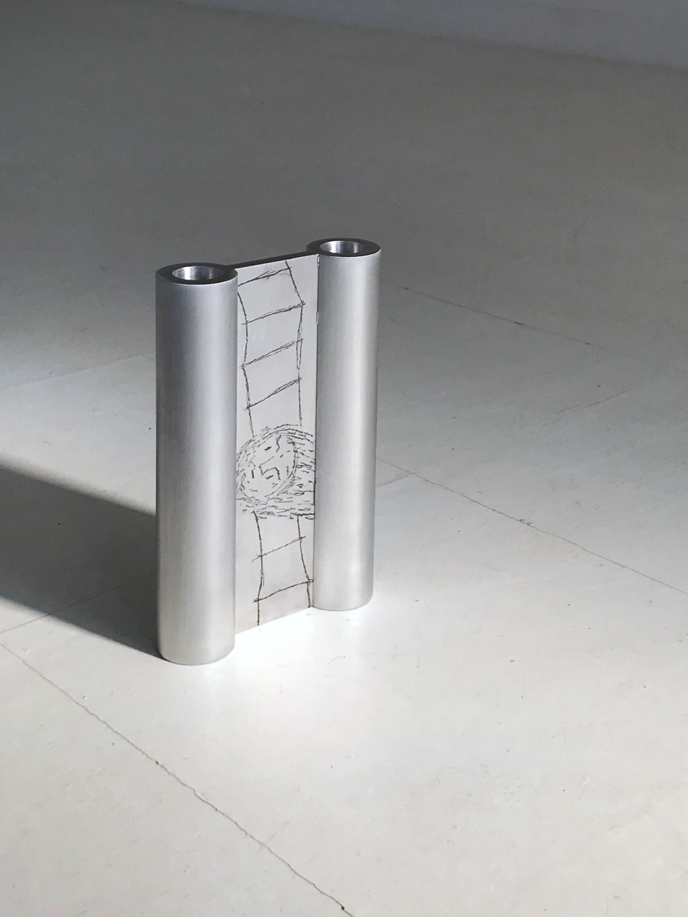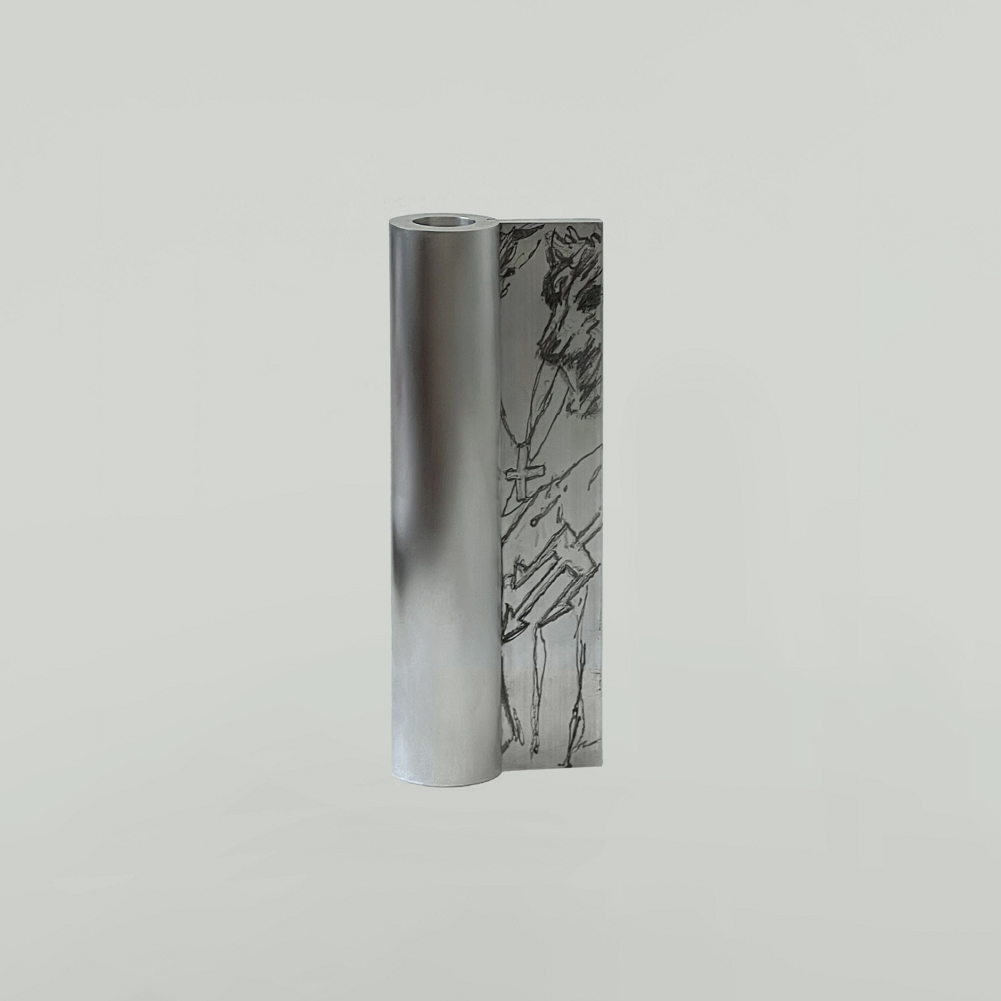 Each sketch on the candle holders is a part-assembly of a larger piece, like the holy bread, creating a larger work out of the entire collection. The engraved sketches are like notes that participate in the ritual of the candle burning and extinguishing.